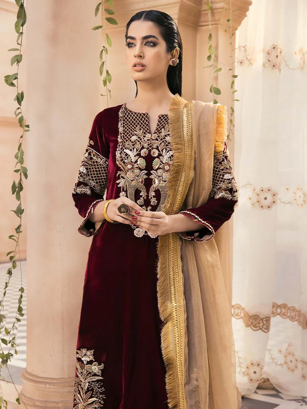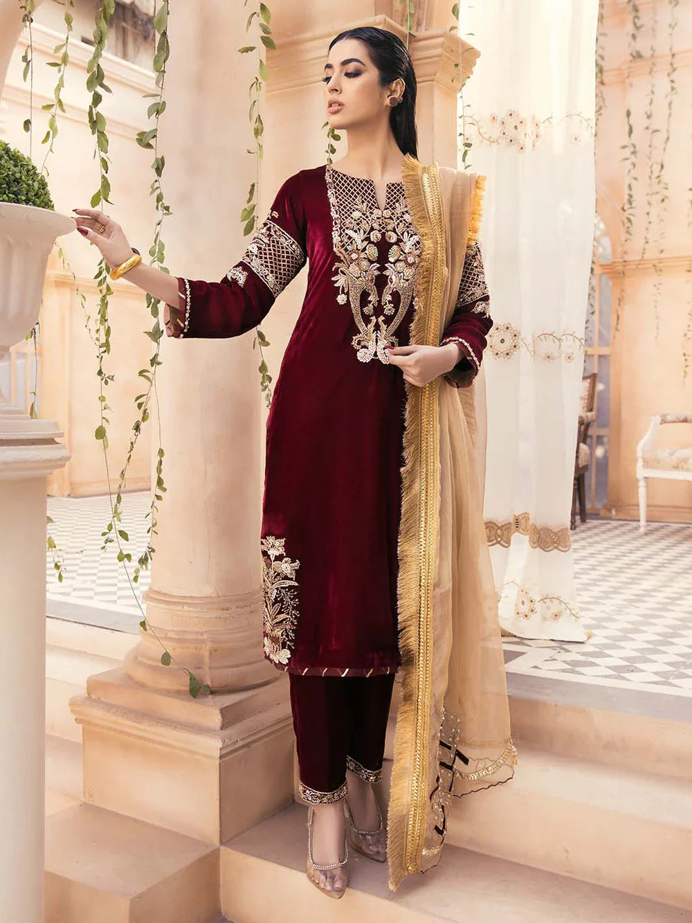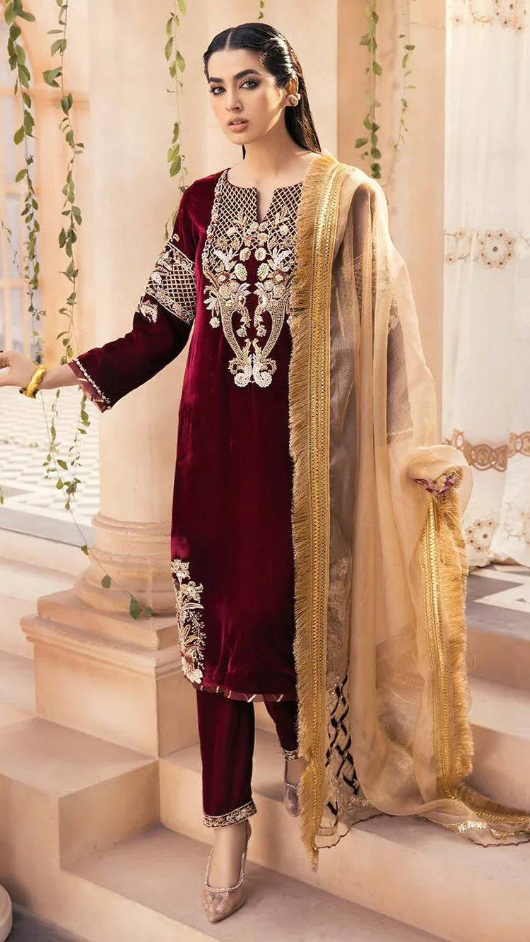 Glide into winter festivities like a gazelle in our classic and elegant 3 piece outfit from the velvet collection. Deep and beautiful maroon-colored, pure velvet shirt is uplifted with refined thread work on the neckline and sleeves. Paired with monochrome velvet pants and a fancy organza dupatta to complete this outfit and make you look effortlessly beautiful. winter.