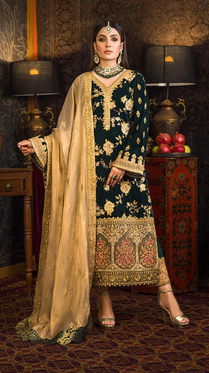 This elegant stitched 3-piece velvet embroidered dress is designed to add a regal touch to your wardrobe. The shirt features a fully heavy embroidered front with intricate detailing that enhances its luxurious appeal. An organza embroidered daman adds graceful charm, while the rich silk embroidered dupatta completes the look with sophistication. Perfect for festive occasions, weddings, or formal gatherings, this ensemble blends comfort with timeless style. Pair it with delicate accessories to create a truly captivating appearance.