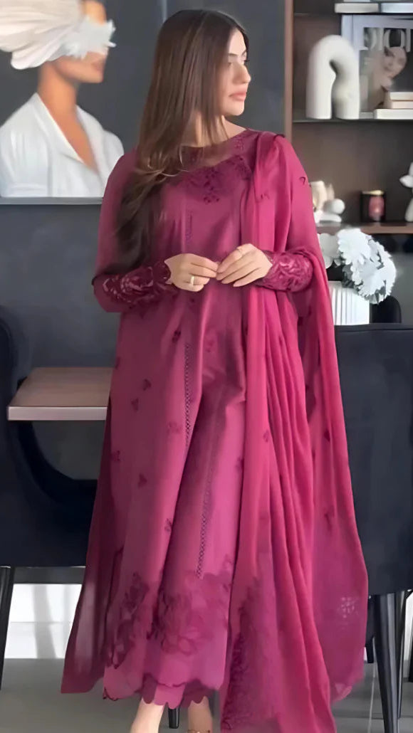 This stitched 3-piece lawn Chickenkari embroidered Alinner frock is a graceful blend of elegance and tradition. The neckline and sleeves are beautifully embroidered on organza, adding a touch of sophistication. The frock features a fully heavy embroidered organza daman, enhancing its overall charm. Paired with an intricately embroidered chiffon dupatta, detailed embroidery work is done on the pallu and all four sides for a refined finish. This ensemble is perfect for formal events or festive occasions, offering both comfort and timeless style. An ideal choice for women who appreciate fine craftsmanship and elegant detailing in every outfit.