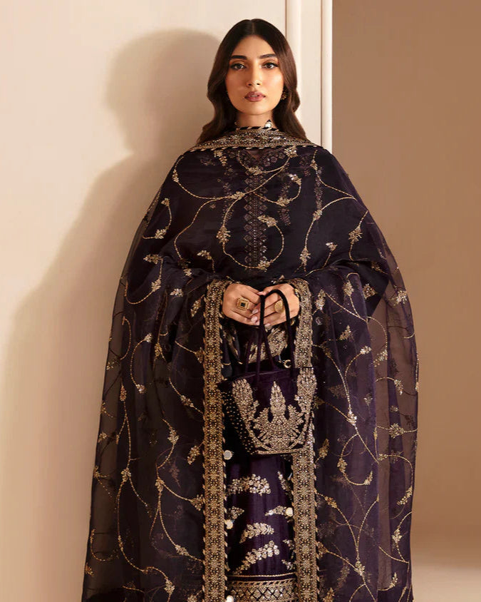 This stitched 3-piece velvet embroidered dress is a statement of elegance and luxury. The front and sleeves are fully adorned with intricate embroidery, showcasing fine craftsmanship and timeless charm. Paired with a richly embroidered organza dupatta, this outfit brings sophistication to every occasion. Designed to perfection, it reflects a graceful blend of tradition and modern style. Ideal for formal gatherings, parties, or festive wear, this dress ensures you stand out beautifully with its regal appeal.