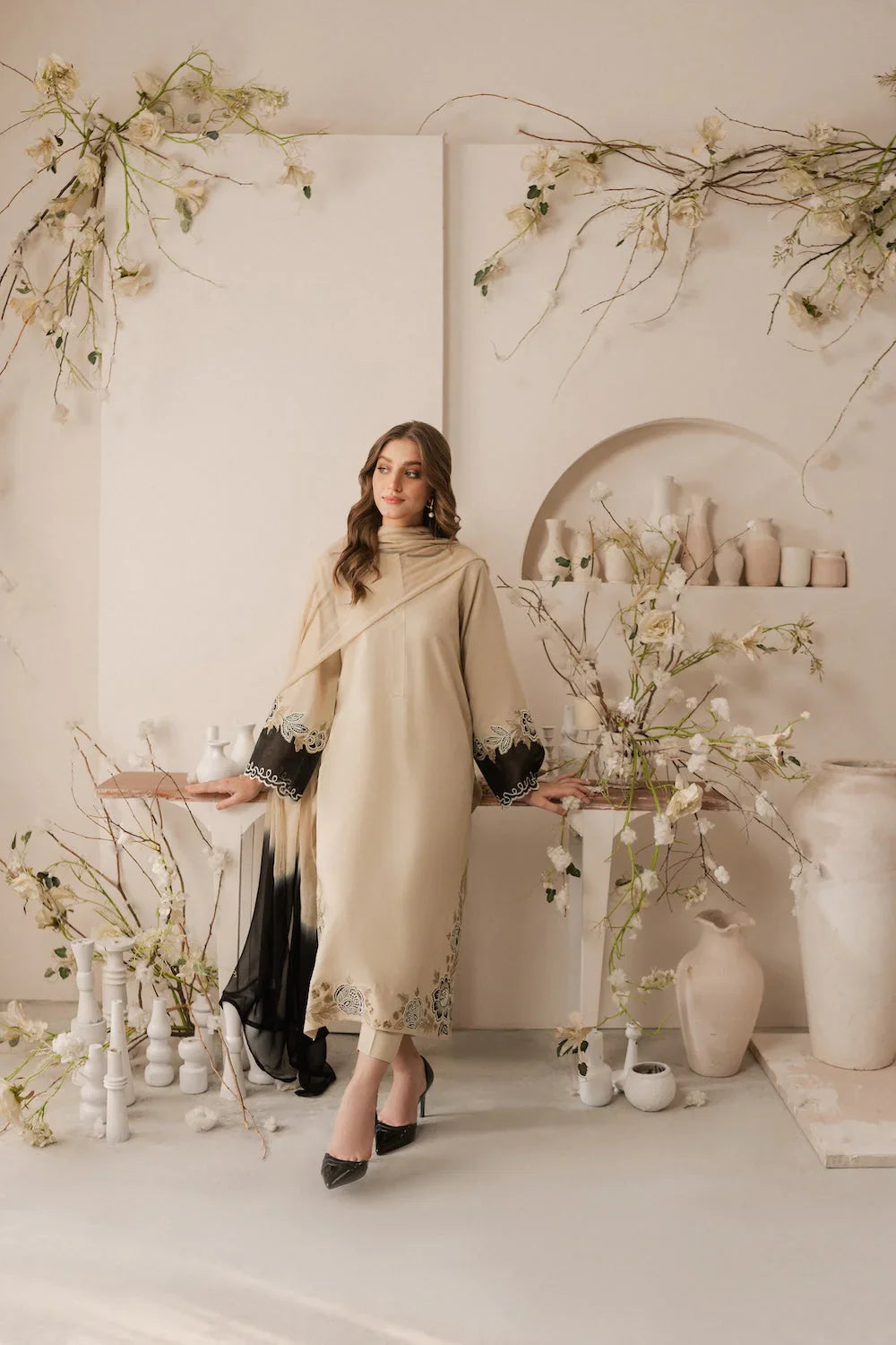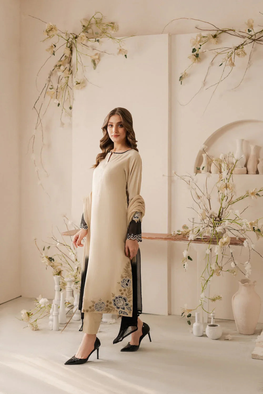 For the woman who knows her mind and is her own guiding light, a majestic kurta set in rich hues of beige and black. Featuring floral embroidered motifs, elevated with organza insertions in the sleeves and daaman, the Ghazal set is handcrafted for pure elegance. Each karigar spends a full-day in creating this intricate work of art and turn it into a masterpiece.