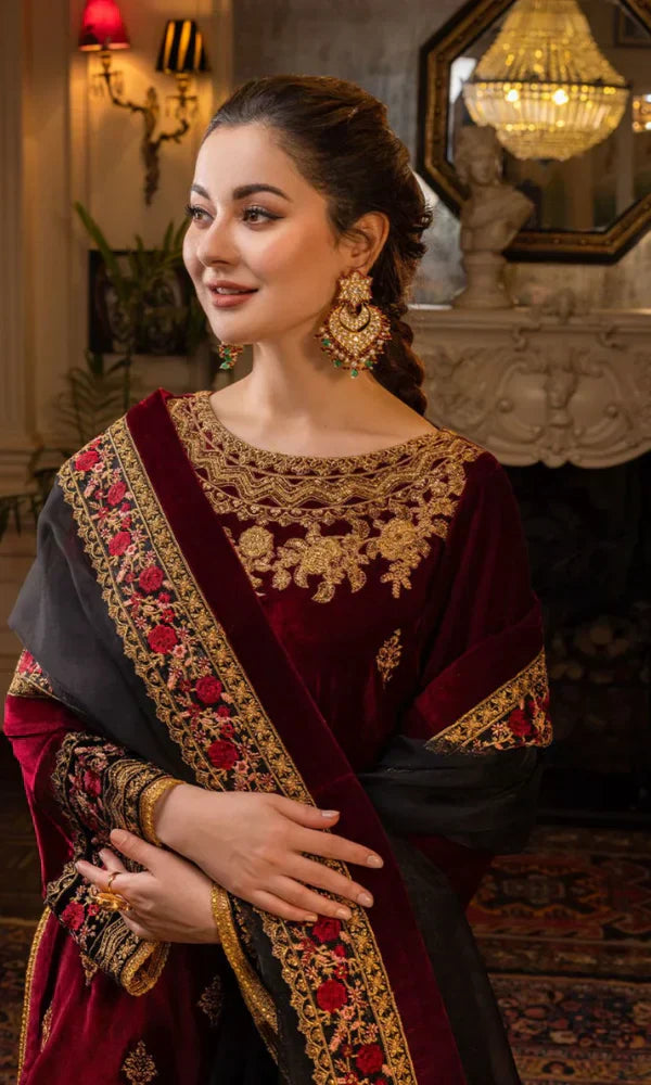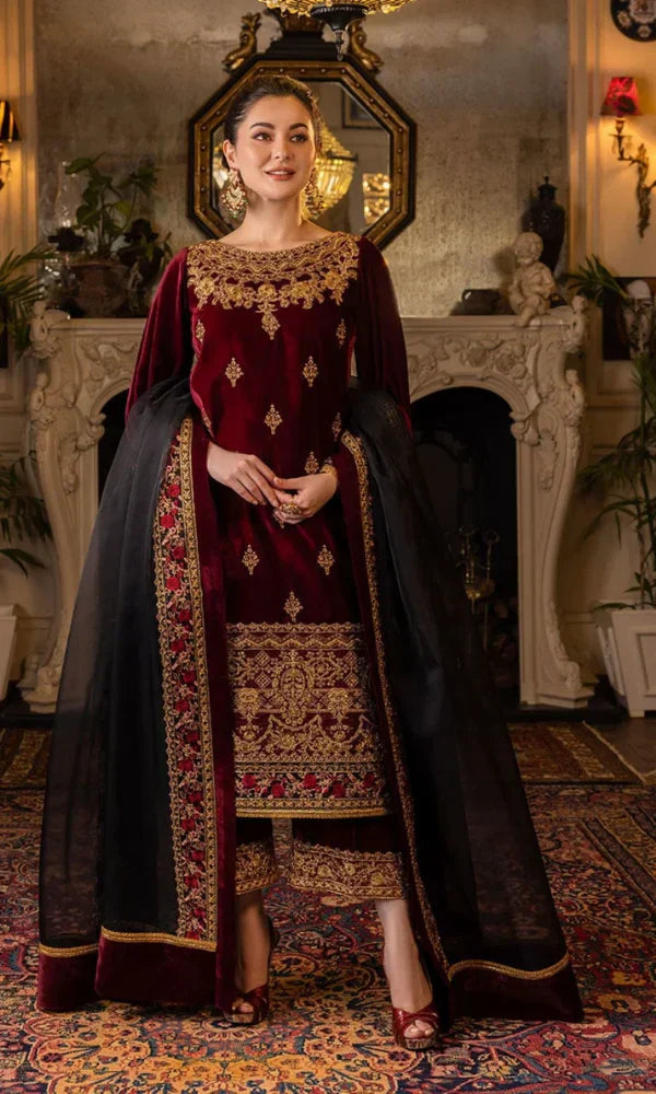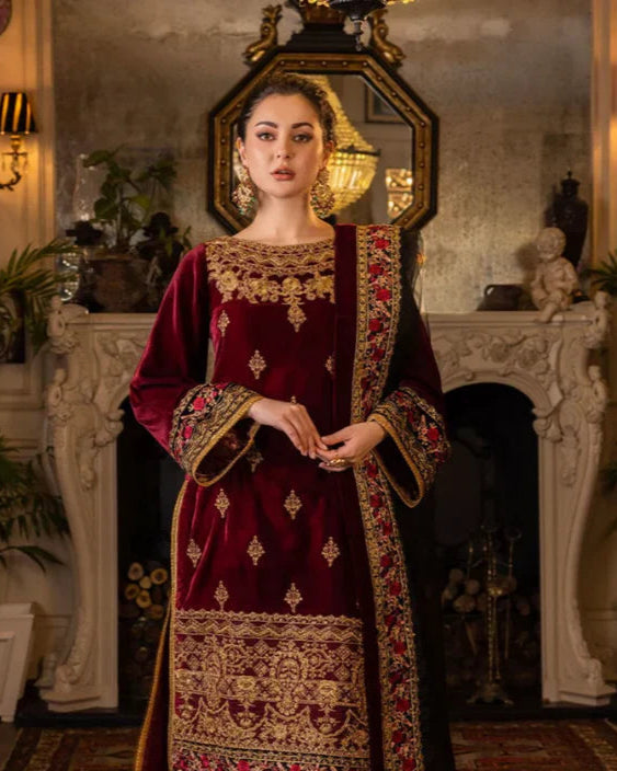 Glide into winter festivities like a gazelle in our classic and elegant 3 piece outfit from the velvet collection. Deep and beautiful maroon-colored, pure velvet shirt is uplifted with refined thread work on the neckline and sleeves. Paired with monochrome velvet pants and a fancy velvet dupatta to complete this outfit and make you look effortlessly beautiful. winter.