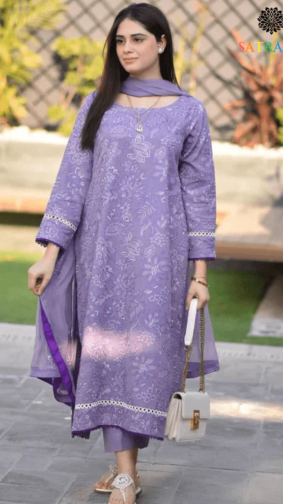 This graceful suit showcases a heavily embroidered front, offering a timeless and elegant appeal. The sleeves also feature matching embroidery, adding delicate detail to the ensemble. It includes a plain dyed back and trouser for a balanced and classic look. Paired with a beautifully embroidered chiffon dupatta, this outfit blends tradition with sophistication. Crafted from soft, breathable fabric, it ensures comfort while making a refined style statement for any occasion.