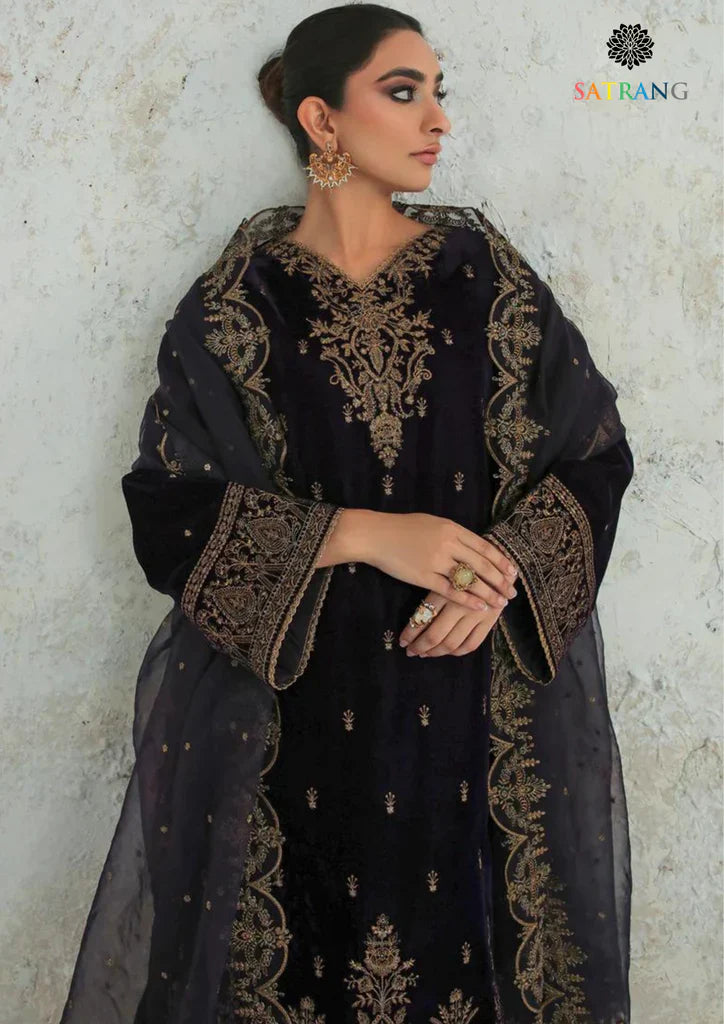 TThis stitched 3-piece velvet embroidered dress is a statement of elegance and luxury. The front and sleeves are fully adorned with intricate embroidery, showcasing fine craftsmanship and timeless charm. Paired with a richly embroidered organza dupatta, this outfit brings sophistication to every occasion. Designed to perfection, it reflects a graceful blend of tradition and modern style. Ideal for formal gatherings, parties, or festive wear, this dress ensures you stand out beautifully with its regal appeal.