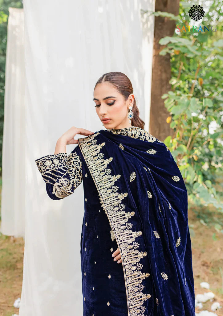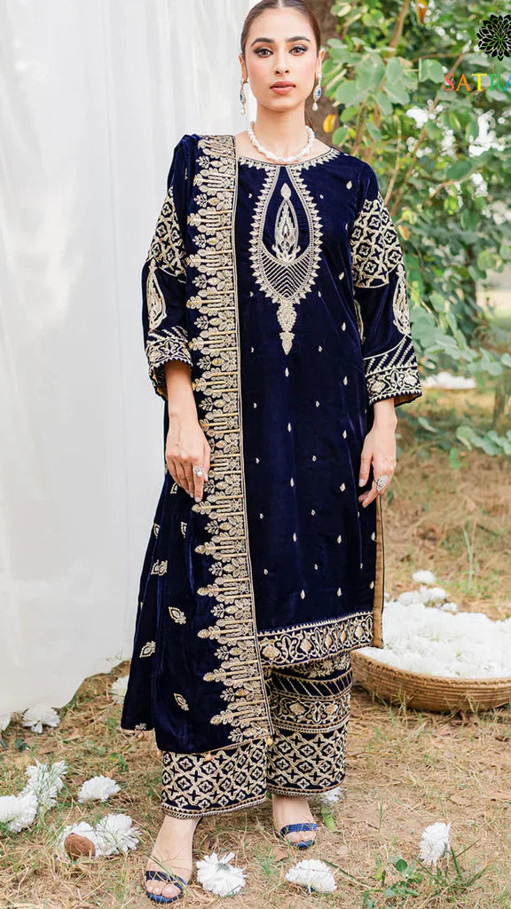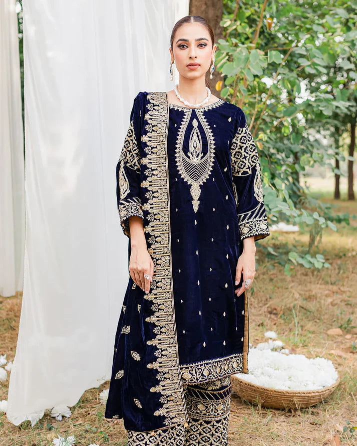 This elegant stitched 3-piece velvet embroidered dress is designed to add a regal touch to your wardrobe. The shirt features a fully heavy embroidered front with intricate detailing that enhances its luxurious appeal. The front and sleeves are fully adorned with intricate embroidery, showcasing fine craftsmanship and timeless charm. Paired with a richly embroidered organza dupatta, this outfit brings sophistication to every occasion. Designed to perfection, it reflects a graceful blend of tradition and modern style. Ideal for formal gatherings, parties, or festive wear, this dress ensures you stand out beautifully with its regal appeal.